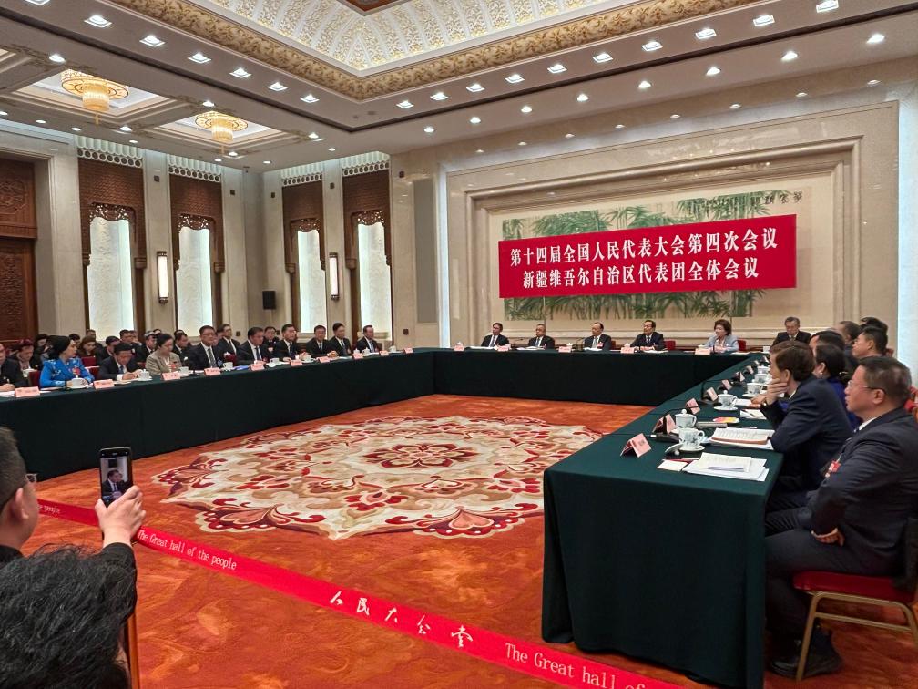 十四屆全國人大四次會議新疆維吾爾自治區(qū)代表團全體會議現(xiàn)場。新華社記者 劉雅萱 攝
