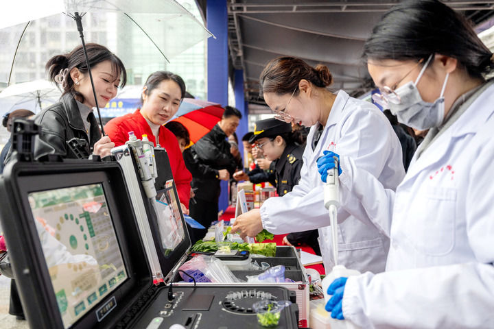 在浙江省湖州市長興縣放心消費嘉年華公益活動現(xiàn)場,該縣食品藥品檢驗檢測中心工作人員為市民提供免費果蔬檢測服務(wù)(2025年3月15日攝)。