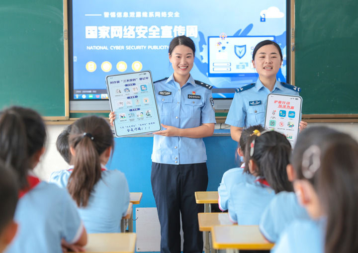 在山東省榮成市府新小學(xué)教室內(nèi),轄區(qū)民警通過案例講解為學(xué)生們普及網(wǎng)絡(luò)安全和防詐騙知識(2025年9月15日攝)。