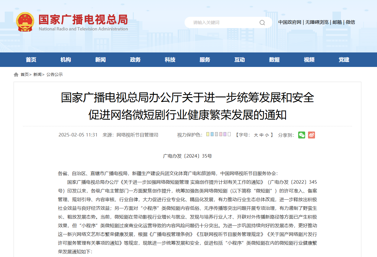 國(guó)家廣播電視總局辦公廳發(fā)布《關(guān)于進(jìn)一步統(tǒng)籌發(fā)展和安全促進(jìn)網(wǎng)絡(luò)微短劇行業(yè)健康繁榮發(fā)展的通知》