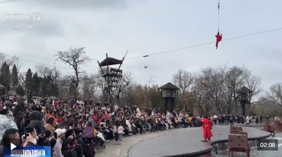 在河南開(kāi)封的萬(wàn)歲山武俠城景區(qū),穿著戲服在臺(tái)上斷案的并不是演員,而是現(xiàn)場(chǎng)選取的游客。在這里,從街頭到巷尾,風(fēng)格各異的演員帶著游客猜拳、破案、比武功,甚至一起走入劇情演繹角色。通過(guò)參與互動(dòng),游客還能賺取“銀票”在景區(qū)購(gòu)物,沉浸體驗(yàn)古代市井生活。景區(qū)里戰(zhàn)馬奔騰、云梯攻城等實(shí)景演出輪番上演。