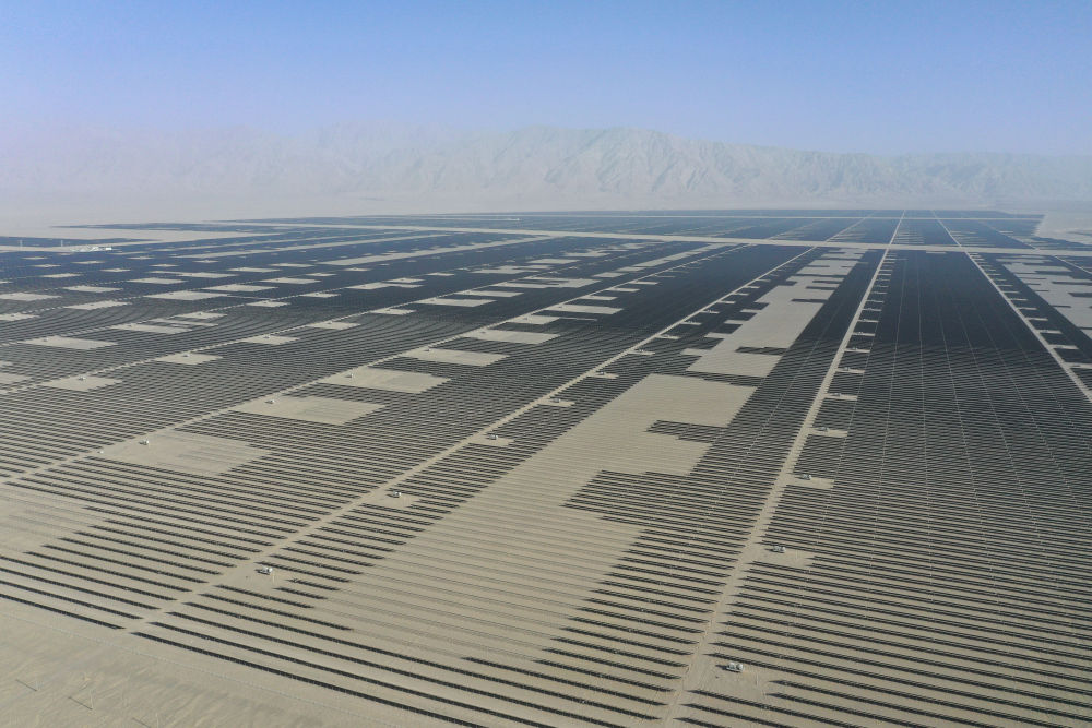 驅(qū)車行駛在巴音郭楞蒙古自治州若羌縣境內(nèi)的塔克拉瑪干沙漠邊緣,浩瀚沙海中,一片片深藍色光伏板如波浪般鋪展至天際。這里是一處400萬千瓦光伏項目現(xiàn)場。