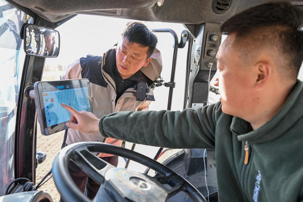 3月24日,在新疆伊犁哈薩克自治州察布查爾錫伯自治縣孫扎齊牛錄鎮(zhèn),羅俊杰(左)和農(nóng)機(jī)手查看北斗自動(dòng)導(dǎo)航系統(tǒng)確定播種地塊 新華社記者 丁磊 攝