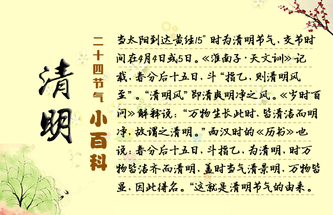 節(jié)選自《二十四節(jié)氣志》/宋英杰 4月5日前后為清明節(jié)氣,氣清景明之意,正是鳥語花香的盛春時(shí)節(jié)?!把匀f物去故而從新,莫不鮮明之謂也。”“萬物生長(zhǎng)此時(shí),皆清凈明潔,故謂之清明。”清明之名,便表征了這一時(shí)節(jié)的天氣是清新、明媚、和暖的。