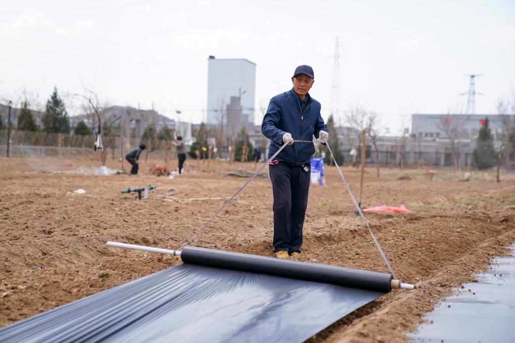 地膜鋪好了,高東元跪在菜畦邊,小心翼翼地用土把邊緣壓實(shí)。看著眼前的菜地,高東元笑著說(shuō):“清明過(guò)后,菜椒、茄子就都可以種了?!彼难凵窭?,盛滿了對(duì)歲稔年豐的期盼。