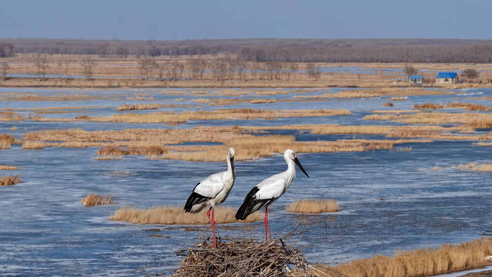 吉林省莫莫格國家級自然保護區(qū)內,東方白鸛在筑巢。新華社發(fā)(潘晟昱 攝)