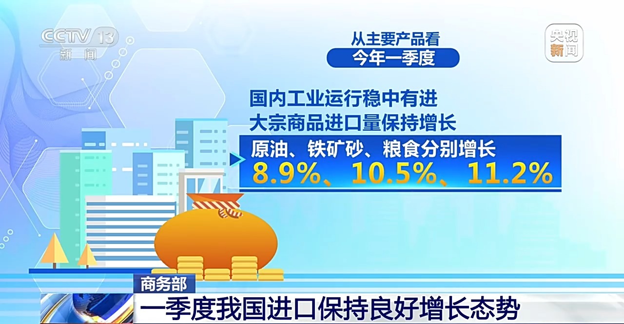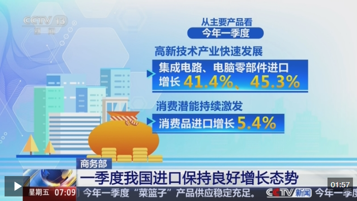 從主要產(chǎn)品看,今年一季度,高新技術(shù)產(chǎn)業(yè)快速發(fā)展,集成電路、電腦零部件進口增長41.4%、45.3%。消費潛能持續(xù)激發(fā),消費品進口增長5.4%。國內(nèi)工業(yè)運行穩(wěn)中有進,大宗商品進口量保持增長,原油、鐵礦砂、糧食分別增長8.9%、10.5%、11.2%。