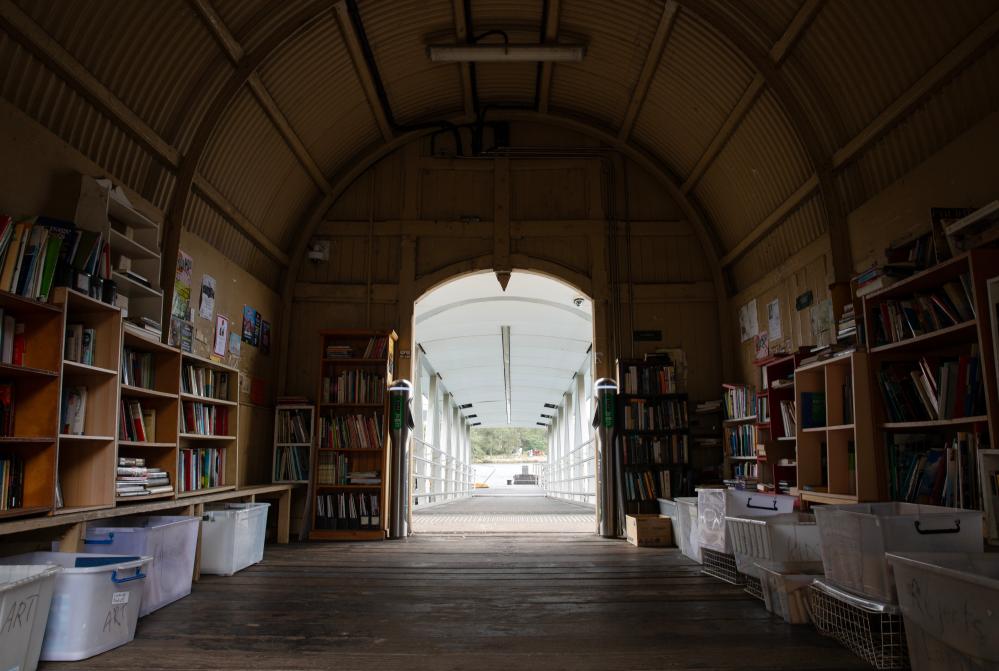 這是4月21日在澳大利亞悉尼市巴爾梅恩區(qū)泰晤士街盡頭的渡輪碼頭上拍攝的“泰晤士街圖書館”內(nèi)景。新華社記者馬平攝