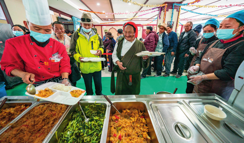 在西藏那曲市色尼區(qū)老年人日間照料中心,老人們?cè)谂抨?duì)打飯(2025年4月25日攝)丁增尼達(dá)攝/本刊