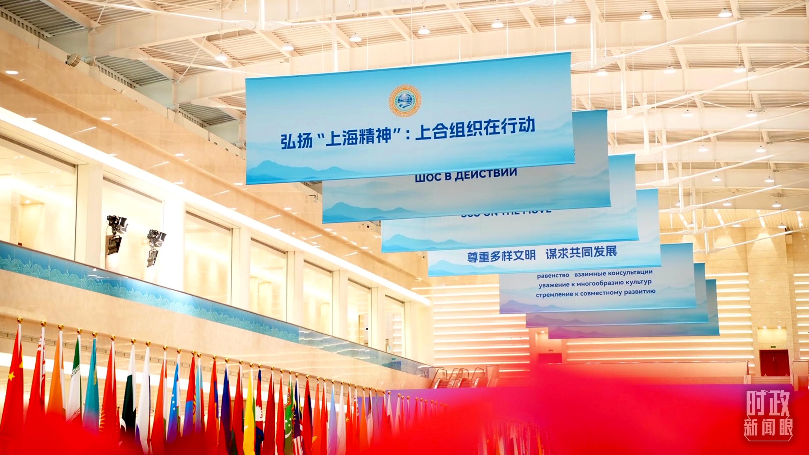 與會各國國旗、上合組織會旗和聯(lián)合國旗幟組成的恢弘旗陣。(總臺央視記者劉琦拍攝)