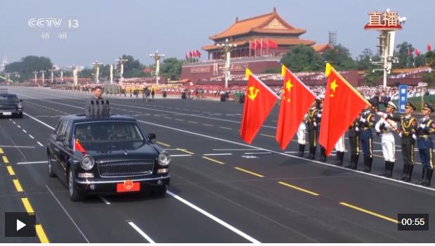 偉大旗幟光耀千秋。中國共產(chǎn)黨黨旗、中華人民共和國國旗、中國人民解放軍軍旗在受閱部隊(duì)最前方迎風(fēng)招展。檢閱車行進(jìn)至黨旗、國旗、軍旗前,敬禮號(hào)角響起,習(xí)近平停車肅立,以注目禮向三面旗幟莊嚴(yán)致敬。