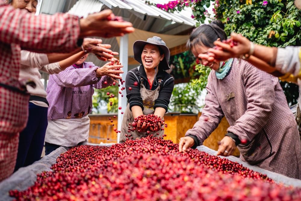 2025年1月8日,在云南普洱思茅區(qū)一咖啡莊園,工作人員慶祝咖啡豐收。