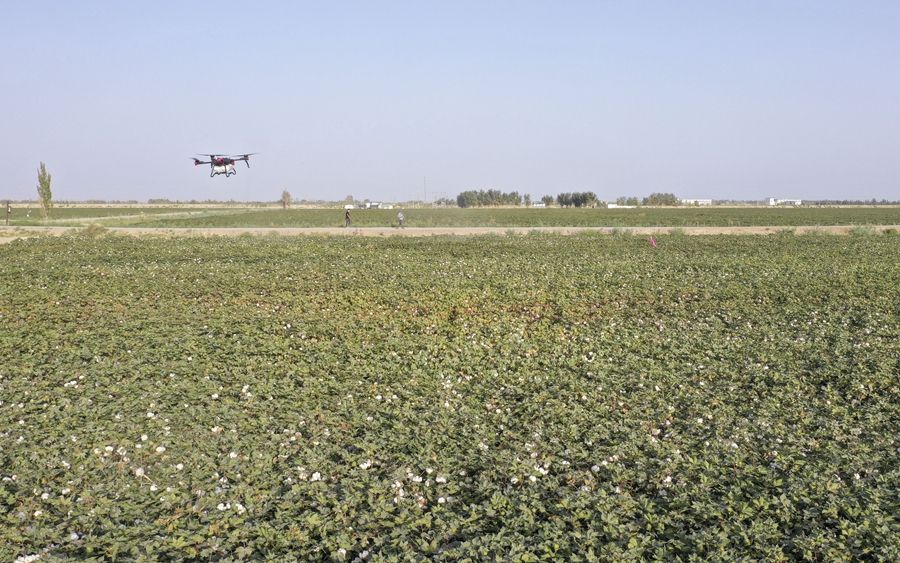 在新疆尉犁縣興平鎮(zhèn)達(dá)西村一處高標(biāo)準(zhǔn)農(nóng)田,種植戶(hù)用無(wú)人機(jī)噴灑脫葉劑(2022年9月20日攝,無(wú)人機(jī)照片)。新華社發(fā)(汪志鵬 攝)