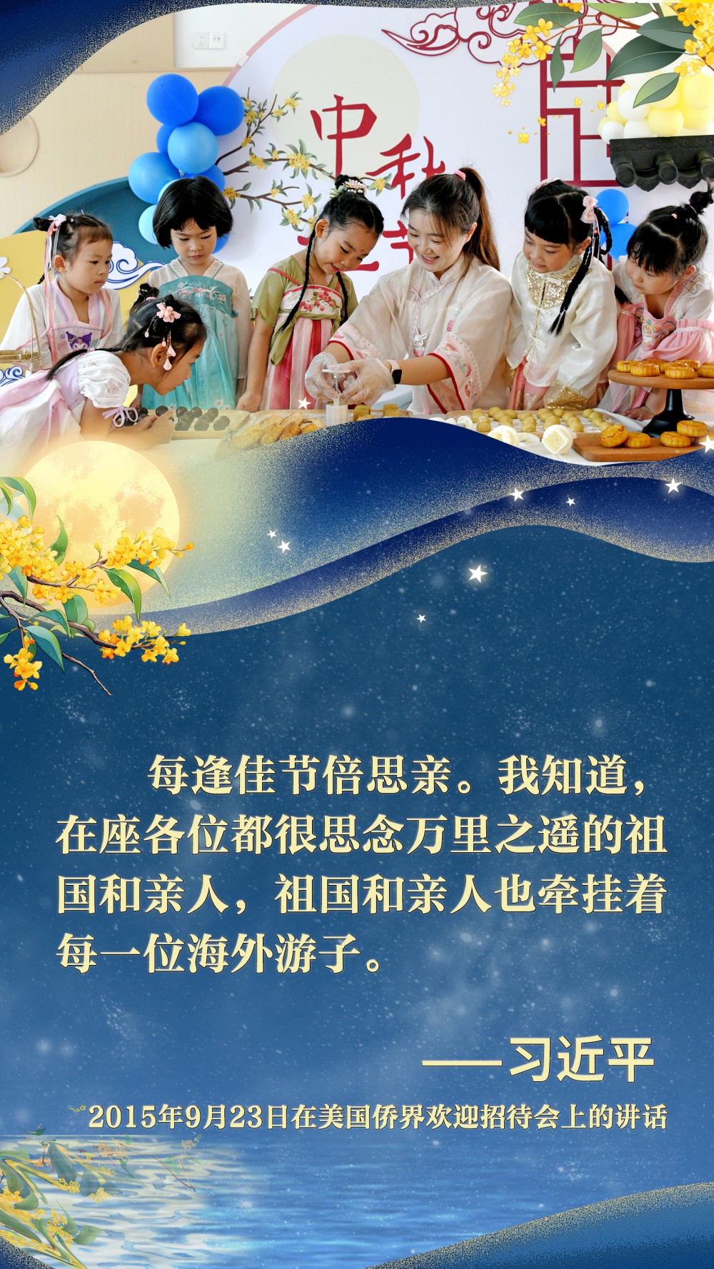 2015年9月23日,中秋佳節(jié)前夕,習(xí)近平總書記在西雅圖出席美國僑界歡迎招待會。他為參加招待會的同胞們帶去了來自家鄉(xiāng)的月餅,并熱情地“歡迎大家?;丶铱纯础薄?/p>