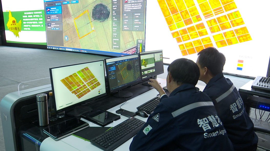 工作人員通過智慧農(nóng)業(yè)數(shù)字指揮平臺研判水稻成熟度(央廣網(wǎng)發(fā) 李延生 攝)