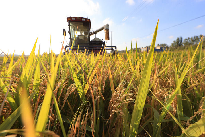 2025年10月16日,在江蘇省連云港市贛榆區(qū)城頭鎮(zhèn)中青墩村,種植戶駕駛收割機(jī)搶收水稻。新華社發(fā)(司偉攝)