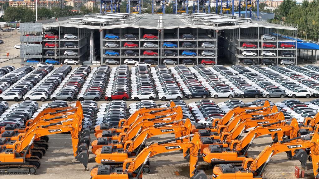 △山東港口煙臺港,國產(chǎn)汽車和工程機(jī)械集結(jié)等待裝船出口。