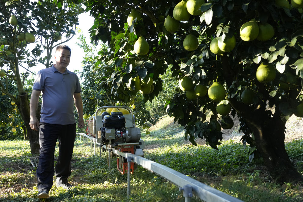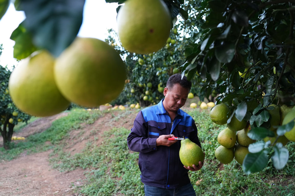 2025年11月7日,柚農在梅州南福金柚種植基地測試柚子甜度。