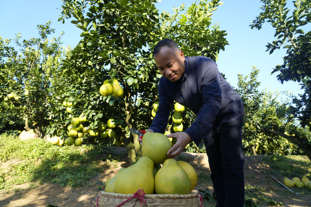 2025年11月7日,柚農在梅州南福金柚種植基地采摘柚子。