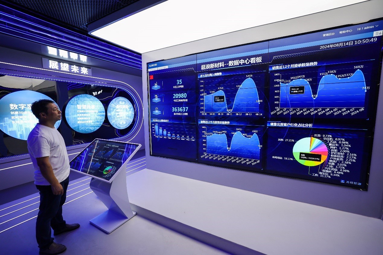 在金華市金東區(qū)江東鎮(zhèn)的浙江超浪新材料有限公司內(nèi),數(shù)據(jù)中心看板實(shí)時顯示企業(yè)流水線的各項(xiàng)生產(chǎn)數(shù)據(jù)。新華社記者 徐昱 攝