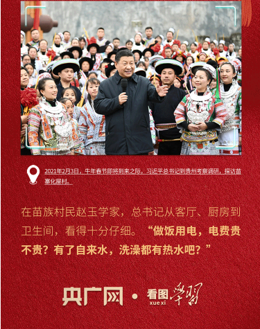 2020年底,貴州最后9個(gè)深度貧困縣退出貧困縣序列。次年2月,總書記就專程來到曾經(jīng)的深度貧困村——貴州省畢節(jié)市化屋村。在苗族村民趙玉學(xué)家里,總書記看得仔細(xì)、問得真切,“做飯用電,電費(fèi)貴不貴?有了自來水,洗澡都有熱水吧?”一句句家常話,嘮的是具體事,暖的是百姓心。