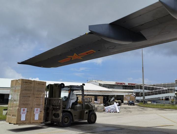 工作人員在湯加首都努庫(kù)阿洛法機(jī)場(chǎng)卸載中國(guó)運(yùn)-20飛機(jī)運(yùn)送來(lái)的援助物資(2022年1月28日攝,手機(jī)照片)。