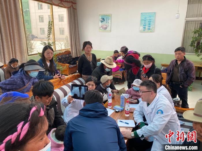 上海醫(yī)務人員在日喀則當?shù)貫楹⒆觽兒Y查?!∩虾J袃和t(yī)院供圖