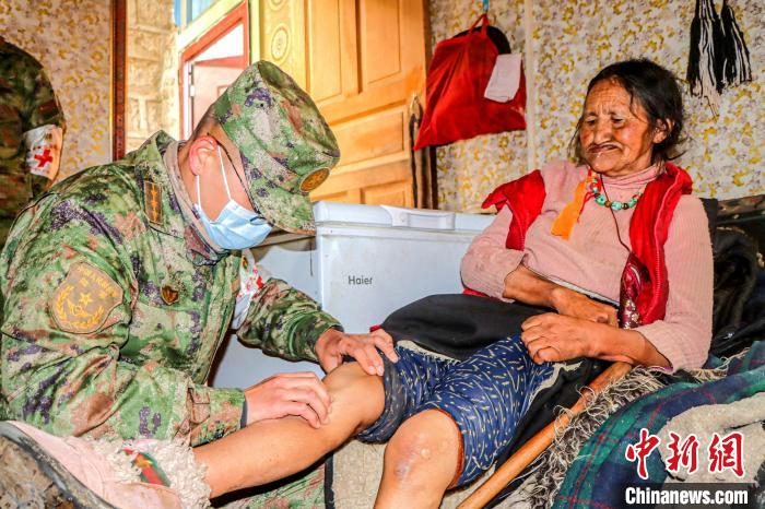 圖為醫(yī)療隊軍醫(yī)來到格桑措姆老人的家中為她檢查膝蓋疼痛問題?!≈煳男?攝