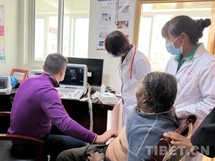 “彩超呢?”北京上地醫(yī)院院長(zhǎng)張宇在衛(wèi)生院工作人員的帶領(lǐng)下來(lái)到衛(wèi)生院二樓為75歲的桑旦江措老人進(jìn)行胸部彩超檢查,“霍主任(中國(guó)中醫(yī)科學(xué)院望京醫(yī)院心內(nèi)科主任)懷疑他有心衰,患者不能平臥睡覺(jué)、走路氣喘、雙腿腫脹,所以我想通過(guò)超聲印證一下,昨天我們也篩查了一些有心衰跡象的群眾,平時(shí)大家覺(jué)得氣喘是小問(wèn)題,忍忍就好了,實(shí)際上它還是很?chē)?yán)重的,要及時(shí)治療。”張醫(yī)生告訴記者,“藏族群眾對(duì)骨科和胃腸道的關(guān)注度更高,但是心臟、血管、糖尿病等不會(huì)立馬表現(xiàn)出來(lái)的慢性病不太重視,這樣往往會(huì)錯(cuò)過(guò)最佳的治療時(shí)間。所以我們應(yīng)該通過(guò)講座和培訓(xùn),一方面要增強(qiáng)群眾的健康意識(shí),另一方面也要培養(yǎng)當(dāng)?shù)赜玫蒙稀⒘舻米〉募夹g(shù)型人才。”