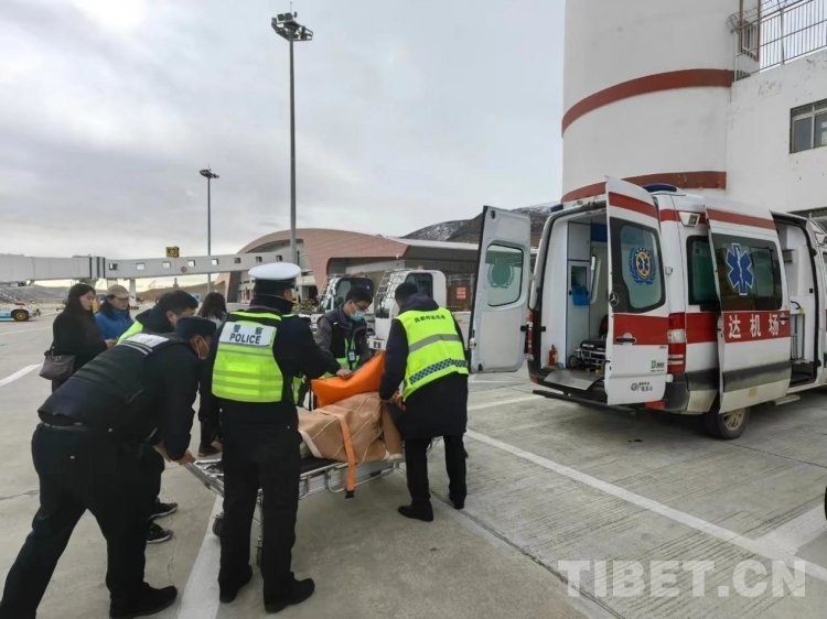 圖為邦達(dá)機場工作人員將嘎吉送上機場救護(hù)車