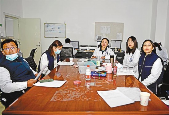 中國(guó)醫(yī)學(xué)科學(xué)院腫瘤醫(yī)院援自治區(qū)人民醫(yī)院醫(yī)生李逸群(右一)與本地醫(yī)生一起交流病例。記者 王敏 攝