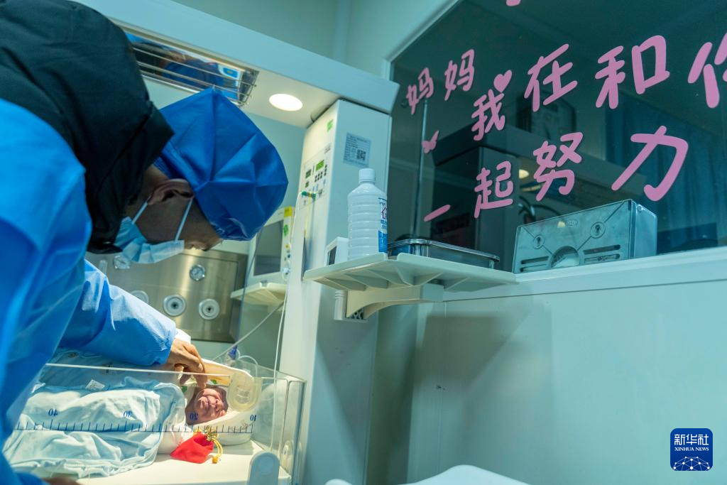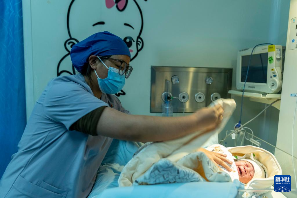 2026年1月1日,西藏自治區(qū)人民醫(yī)院婦產(chǎn)科助產(chǎn)醫(yī)生次拉在包裹新生兒。新華社記者 旦增尼瑪曲珠 攝