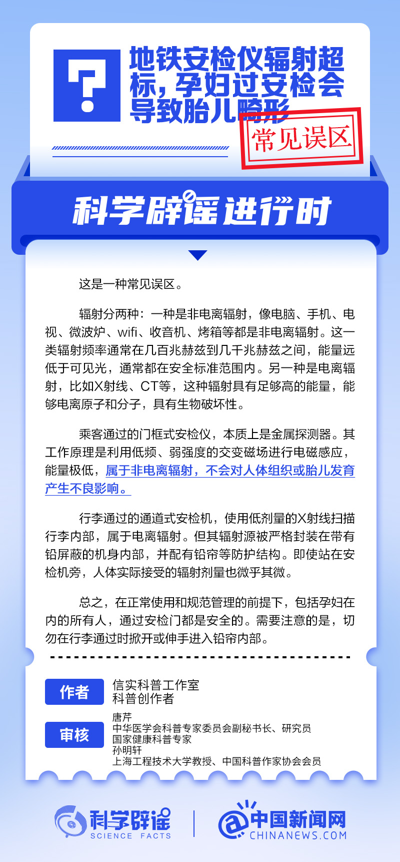乘客通過的門框式安檢儀,本質(zhì)上是金屬探測器。其工作原理是利用低頻、弱強度的交變磁場進行電磁感應(yīng),能量極低,屬于非電離輻射,不會對人體組織或胎兒發(fā)育產(chǎn)生不良影響。行李通過的通道式安檢機,使用低劑量的X射線掃描行李內(nèi)部,屬于電離輻射。但其輻射源被嚴格封裝在帶有鉛屏蔽的機身內(nèi)部,并配有鉛簾等防護結(jié)構(gòu)。即使站在安檢機旁,人體實際接受的輻射劑量也微乎其微。在正常使用和規(guī)范管理的前提下,包括孕婦在內(nèi)的所有人,通過安檢門都是安全的。(來源:@科學(xué)辟謠 中國新聞網(wǎng)微博)