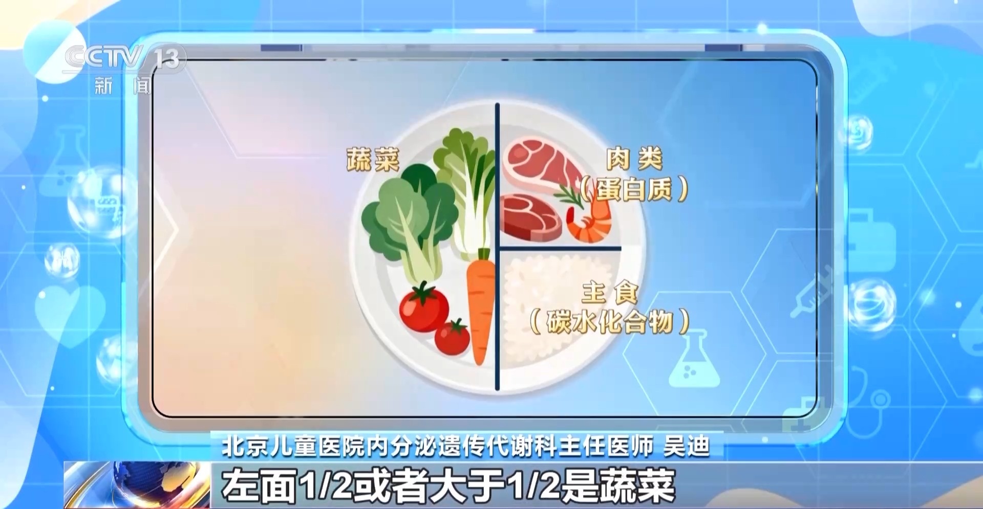 北京兒童醫(yī)院內(nèi)分泌遺傳代謝科主任醫(yī)師 吳迪:早上要吃飽,開啟一天的生活元?dú)鉂M滿,中午要吃好,營(yíng)養(yǎng)要均衡搭配,晚上要吃得早一些,吃得少一些,睡覺(jué)前2到3個(gè)小時(shí)不建議進(jìn)食。一般情況下一個(gè)圓盤子,可以中間畫一條線,左面1/2或者大于1/2是蔬菜,右側(cè)上面1/4是蛋白質(zhì),右側(cè)下面1/4是主食。