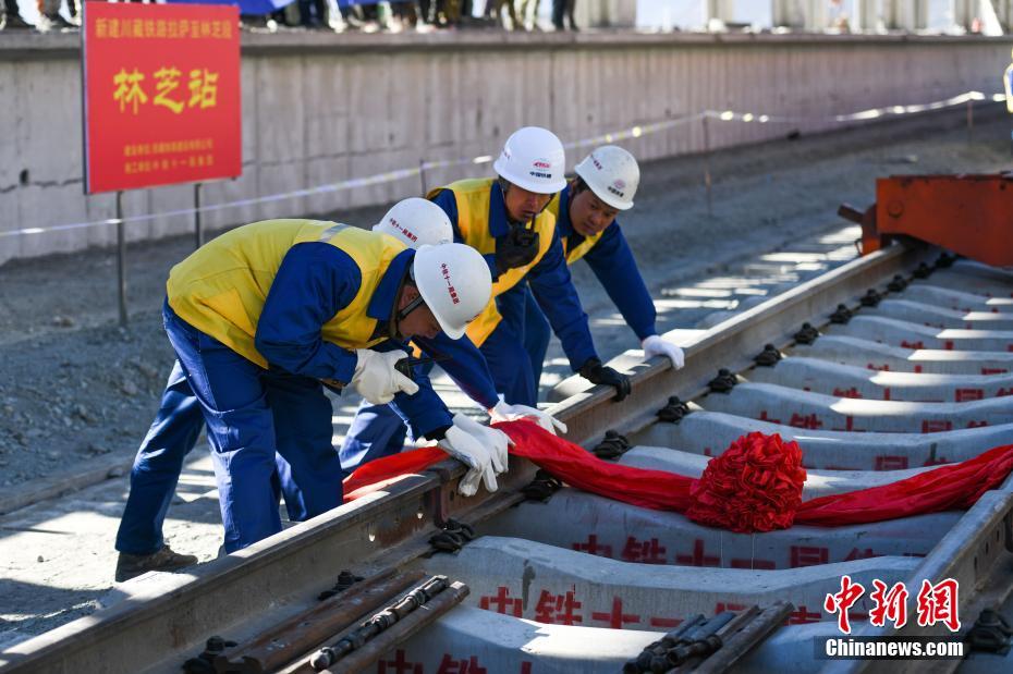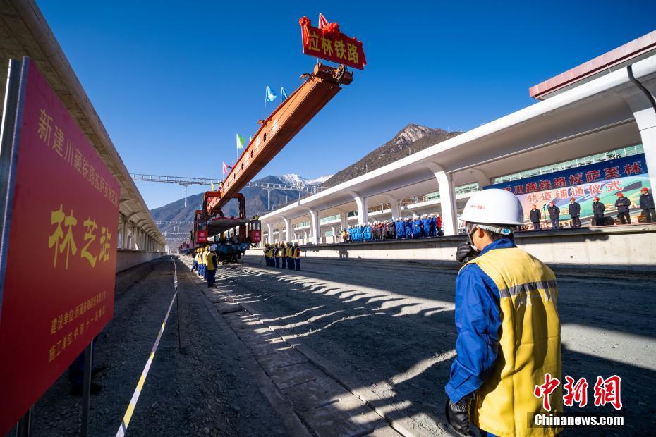 12月31日,拉林鐵路最后一段軌排鋪設(shè)現(xiàn)場。當(dāng)日,在西藏林芝市尼洋河畔的新建林芝火車站,川藏鐵路拉薩至林芝段(拉林鐵路)最后一段軌排順利鋪設(shè),這標(biāo)志著拉林鐵路399.61公里的正線軌道全部鋪通,西藏東南地區(qū)結(jié)束無鐵路歷史。拉林鐵路起自西藏自治區(qū)首府拉薩,終點為林芝市,正線全長435.5公里,新建正線403.1公里,系西藏首條電氣化鐵路,設(shè)計行車速度為160km/h,全線計劃于2021年6月30日建成通車。中新社記者 何蓬磊 攝