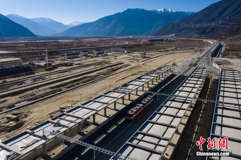 12月31日,中鐵十一局軌道車通過鋪設(shè)完成的拉林鐵路林芝站。當(dāng)日,在西藏林芝市尼洋河畔的新建林芝火車站,川藏鐵路拉薩至林芝段(拉林鐵路)最后一段軌排順利鋪設(shè),這標(biāo)志著拉林鐵路399.61公里的正線軌道全部鋪通,西藏東南地區(qū)結(jié)束無鐵路歷史。拉林鐵路起自西藏自治區(qū)首府拉薩,終點為林芝市,正線全長435.5公里,新建正線403.1公里,系西藏首條電氣化鐵路,設(shè)計行車速度為160km/h,全線計劃于2021年6月30日建成通車。(無人機照片)中新社記者 何蓬磊 攝
