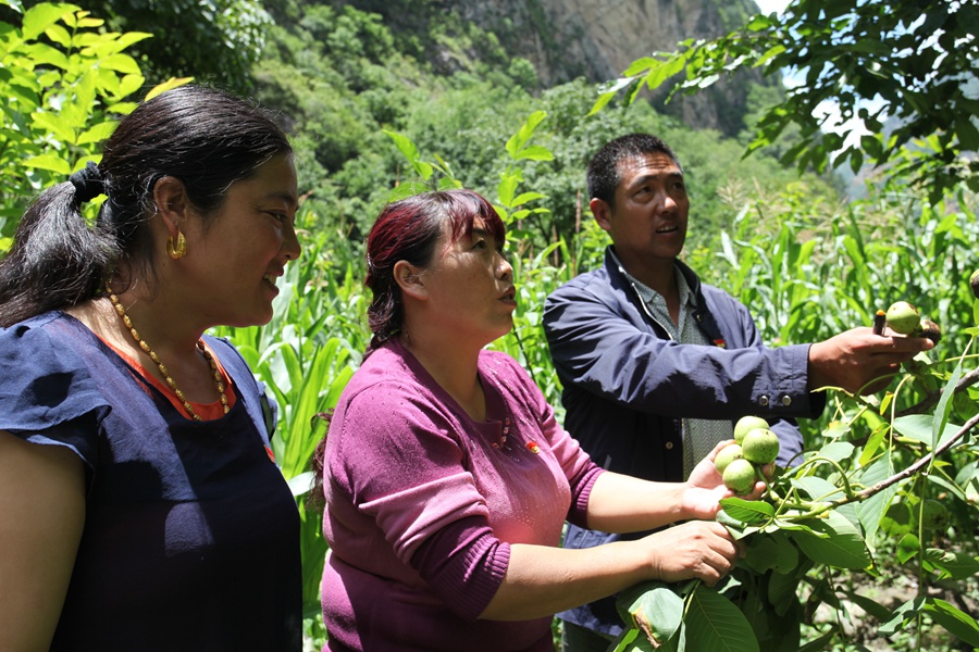 圖為余德春帶村民查看核桃種植