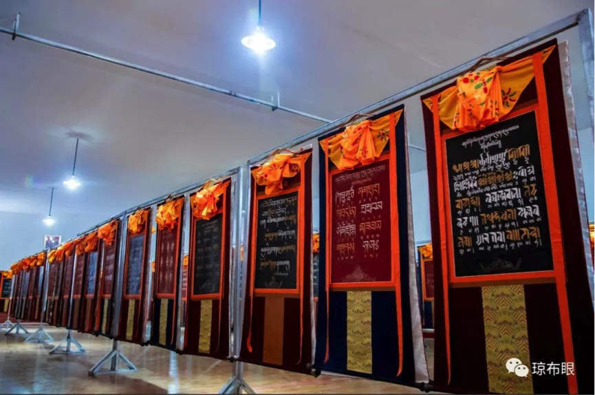 據(jù)悉,《藏文字體最多的唐卡大集》項目歷時兩年的時間完成,通過收集、整理,采用象雄時期的列磚體、稞體、烏金體等藏文字體書寫而成,內(nèi)容包括《習近平談治國理政》《四講四愛》《薩迦格言》《水木格言》《瓊布民間諺語》等,其中藏文書法類唐卡218種,人物造像類唐卡5幅,前言、結(jié)語唐卡2幅,共計225幅唐卡。