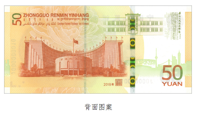紀(jì)念鈔背面主景圖案為中國(guó)人民銀行大樓,輔以牡丹花、中國(guó)人民銀行舊址、第一套人民幣發(fā)行布告及城市建筑剪影圖案。票面左上角為面額數(shù)字“50”,中國(guó)人民銀行漢語(yǔ)拼音字母和蒙、藏、維、壯四種民族文字的“中國(guó)人民銀行”字樣與面額。票面下方為行長(zhǎng)章與年號(hào)文字“2018年”。票面右下角為面額數(shù)字“50”,漢語(yǔ)拼音字母“YUAN”。