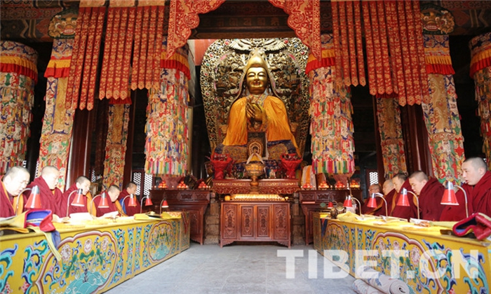 圖為雍和宮僧人端坐于宗喀巴大師像兩側(cè)誦經(jīng)。
