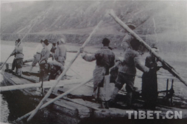 圖為1950年7月,154團(tuán)在金沙江上造的第一艘能載汽車(chē)的大木船。