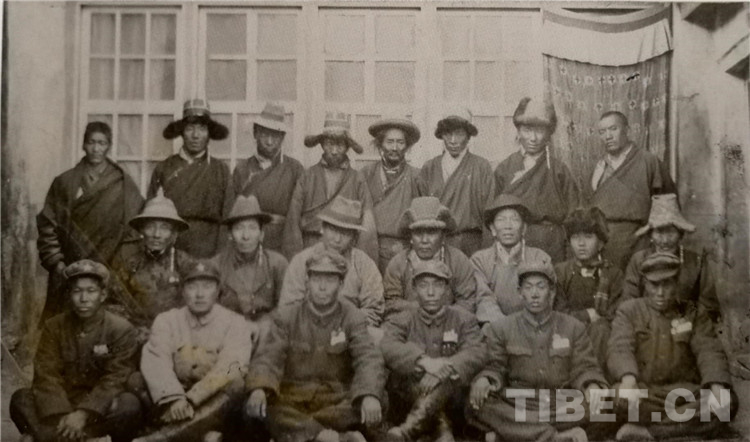 圖為1951年11月22日,進(jìn)藏先遣團(tuán)舉行江孜上層第一次茶話會(huì),經(jīng)過(guò)座談協(xié)商解決了部隊(duì)采購(gòu)、開(kāi)荒生產(chǎn)土地等問(wèn)題。圖為全體參會(huì)人員合影。一排右三為楊軍、右四為郄晉武。