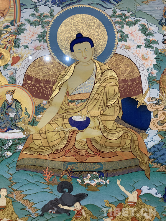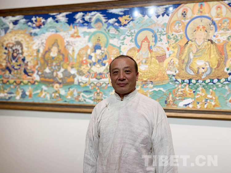 很多人對唐卡并不陌生,但對一幅唐卡是怎么被畫出來的卻是一知半解。唐卡的內(nèi)容大多來源于佛教里的經(jīng)文,里面有詳細的文字描寫,佛的穿著,顏色的搭配,甚至是佛們佩戴的首飾、拿的法器都有明確且詳細的記錄和與描寫。藝術家還需要有豐富的想象力和創(chuàng)造力,要有很強的構圖能力,最重要的是要遵照《度量經(jīng)》等佛教儀軌,正規(guī)的去畫。“創(chuàng)作一幅唐卡不容易,藝術家必須要懂佛教的文化、儀軌,懂《度量經(jīng)》,再加上藝術家自己的藝術創(chuàng)造能力,才能夠畫好一幅唐卡,這需要藝術家的綜合能力。”娘本繼續(xù)說:“起稿、涂色、暈染、拉金線、拉線條等每一步驟都是在考核藝術家自身的能力,藝術家自己要不斷地學習:學習佛教文化,了解文化的內(nèi)涵,藝術家需要更多地把心思投入到唐卡,并提高自身的藝術造詣才能夠畫好一幅唐卡?!?/p>