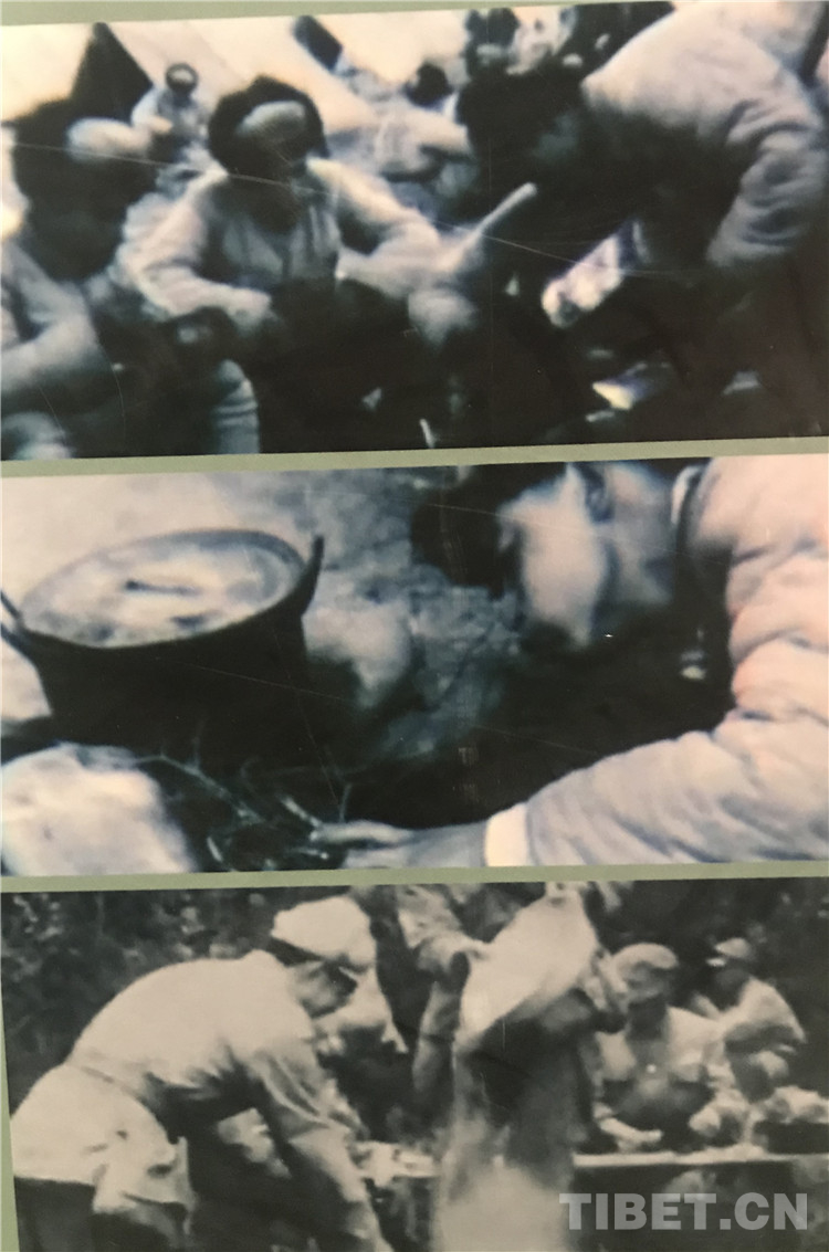 圖為修路和建設(shè)機(jī)場休整期間,戰(zhàn)士們熱火朝天,生火做飯的場景。 翻拍:龍真多吉