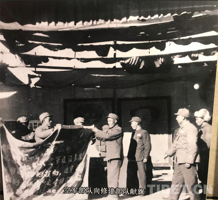 圖為空軍部隊(duì)向修建部隊(duì)獻(xiàn)旗。 翻拍:龍真多吉