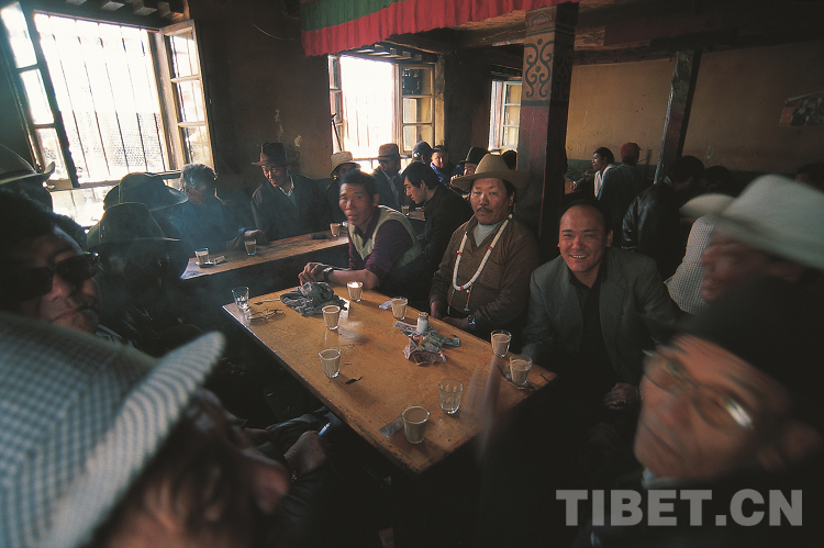 近幾十年,拉薩又興起飲一種由印度傳來(lái)的“甜茶”,原料是來(lái)自印度或我國(guó)云南的紅茶,加鮮奶和糖煮成,味道甜爽滑膩。不管是老年人還是年輕人,大家都喜歡聚在甜茶館里,因?yàn)槟抢锊粌H可以喝茶,還是一個(gè)聊天交流的場(chǎng)所。那也是我的最愛,光明甜茶館、革命甜茶館都是我常去的地方。走累了就隨便走進(jìn)一家路邊的茶館,先和身旁的人點(diǎn)頭笑笑,然后在他們身邊擠著坐下,一把零錢往桌子上一放,送茶員就會(huì)拎著茶桶和小玻璃杯過(guò)來(lái),給你倒上一杯茶,然后數(shù)走茶錢。如果你沒有零錢,送茶員會(huì)自行找好零錢放回你面前的桌上。雖然聽不懂藏語(yǔ),但我很享受這種地道的氛圍,于是常常在甜茶館里待著。