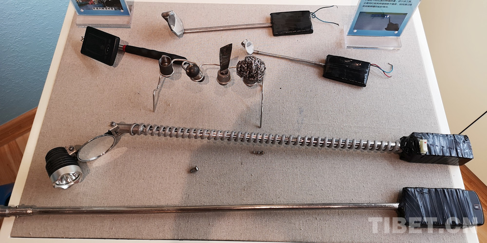 圖為楊永磊設(shè)計的管道內(nèi)熔渣挖取工具(圖上部三個)、焊縫外觀檢查工具(圖下部兩個),前者能以鏟、掃、粘或吸的方式將管道內(nèi)熔渣清理干凈,后者以燈照亮焊縫倒映于鏡面,便于觀察刁鉆位置焊縫的實(shí)際情況 攝影:李元梅
