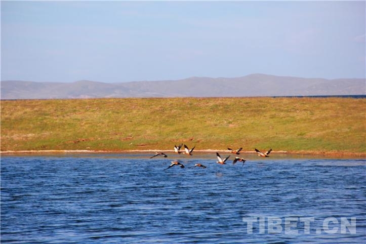 圖為鄂陵湖上水鳥(niǎo)飛過(guò) 攝影:王茜