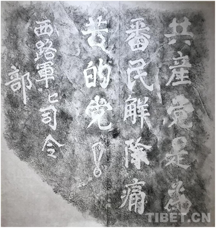 紅軍長(zhǎng)征在藏區(qū)留下了諸多遺跡,展覽中的《黑水縣沙石多鄉(xiāng)紅軍標(biāo)語》(1935年)便是其中一處。據(jù)歷史記載,1935年7月至1936年8月,紅一、四方面軍先后三次駐扎或經(jīng)過四川,黑水(今四川省阿壩藏族羌族自治州黑水縣)藏族群眾曾幫助紅軍熬鹽、籌糧,籌措物資。拓片中赫然醒目的標(biāo)語見證了這一段歷史:“共產(chǎn)黨是為番民解除痛苦的黨!”