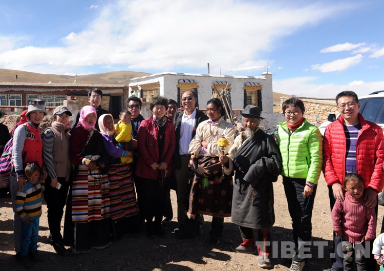這是唐召明陪同中國評劇院藝術家和篩查先心病的北京安貞醫(yī)院小兒心臟病專家顧虹,來到藏北班戈縣青龍鄉(xiāng)采風、篩查先心病,并與牧民群眾合影留念。(唐召明提供,2015年10月8日攝)